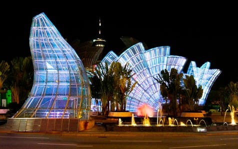 Installation of 400 Philips Colour LED strips including Pharos controller at the roundabout in front of Grand Lisboa. Includes interface with existing AMX touchscreen controller. Industrial Rope access techniques used to access structure. Testing and commissioning of control systems included.